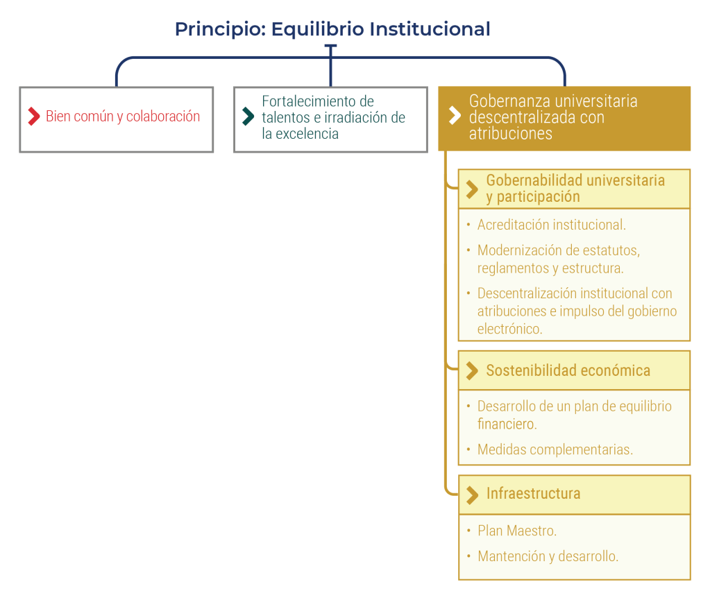 La gobernanza universitaria debe ser inclusiva, democrática, descentralizada con atribuciones y condiciones, que fomente la participación activa de la comunidad triestamental en los procesos de toma de decisiones. Para ello, se requiere como garantía, la sostenibilidad económica de la Universidad que favorezca un desarrollo equilibrado y el potenciamiento de nuestras máximas capacidad en respuesta a los desafíos futuros. Este eje propone dimensiones necesarias para optimizar la estructura e infraestructura institucional, adecuar las normativas a un escenario de descentralización y garantizar el equilibrio financiero para una gestión universitaria moderna.